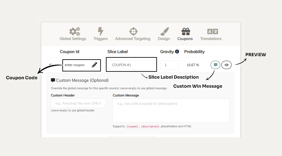 Custom Header + Message → Optional - By default there is a common Win Message for all slices. If you want, you can personalize that for each slice.