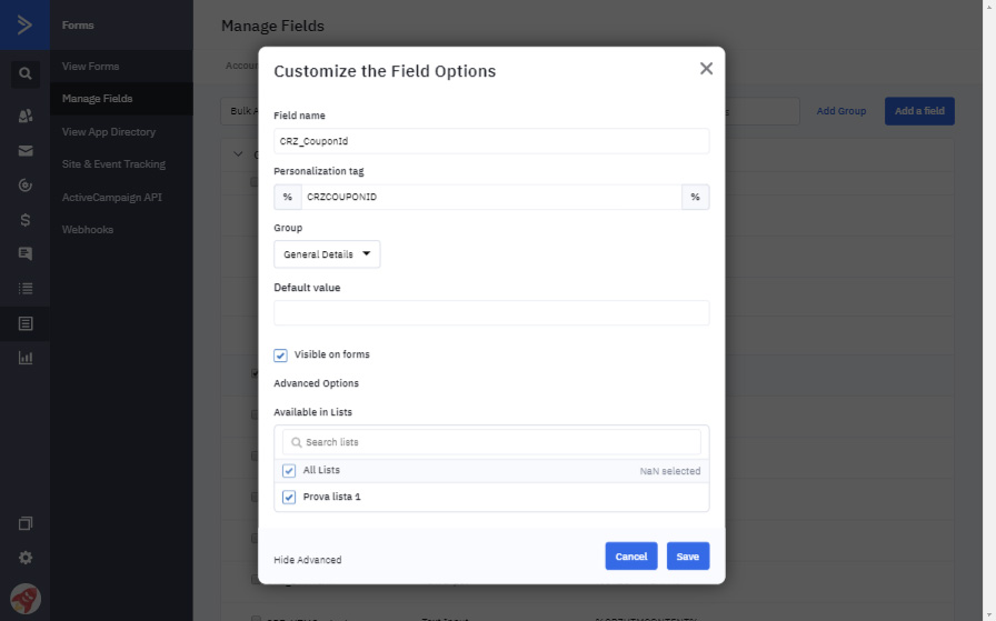 - Click on "Save" (will take a few seconds to create the Custom fields on ActiveCampaign)